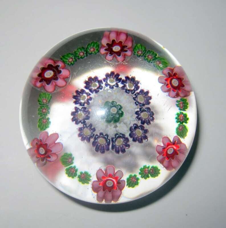 With a central deep green cane, surrounded by a ring of white star canes and another ring of purple and yellow canes, and with a further ring of large pink and red canes, spaced with small apple green canes.