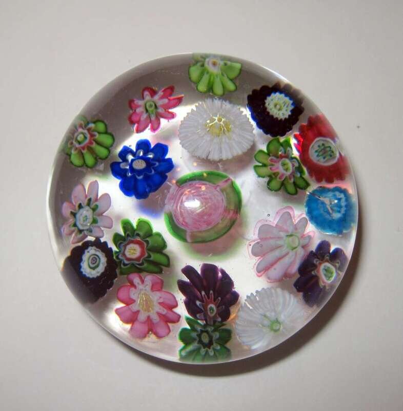 With a nineteen spaced canes, including a central pink and green 'Clichy' rose; encased in clear glass.
