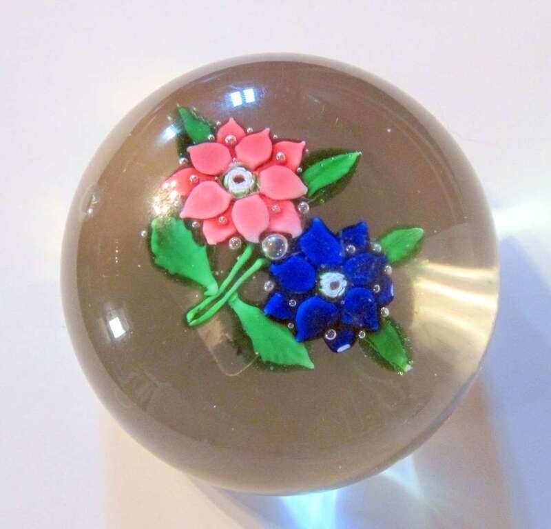 With a pink and blue clematis, each centered by Clichy-type rose canes, issuing from a leafy stem; encased in clear glass.