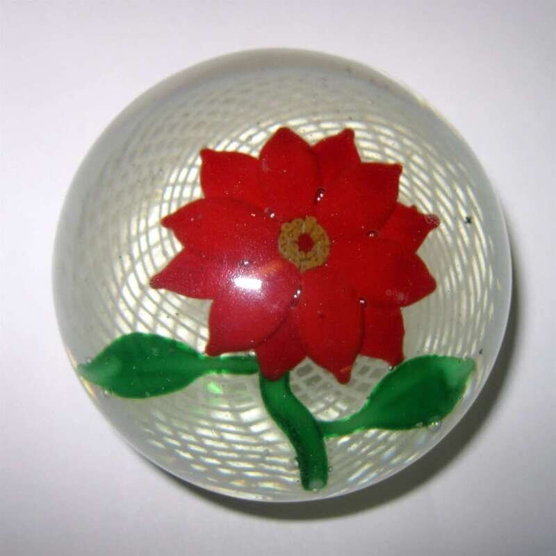 With a double red clematis flower, leading from a curved green stem, with two leaves, on a latticinio base.