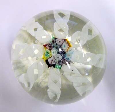 With a central cluster of various canes issuing white latticinio twists; encased in clear glass.