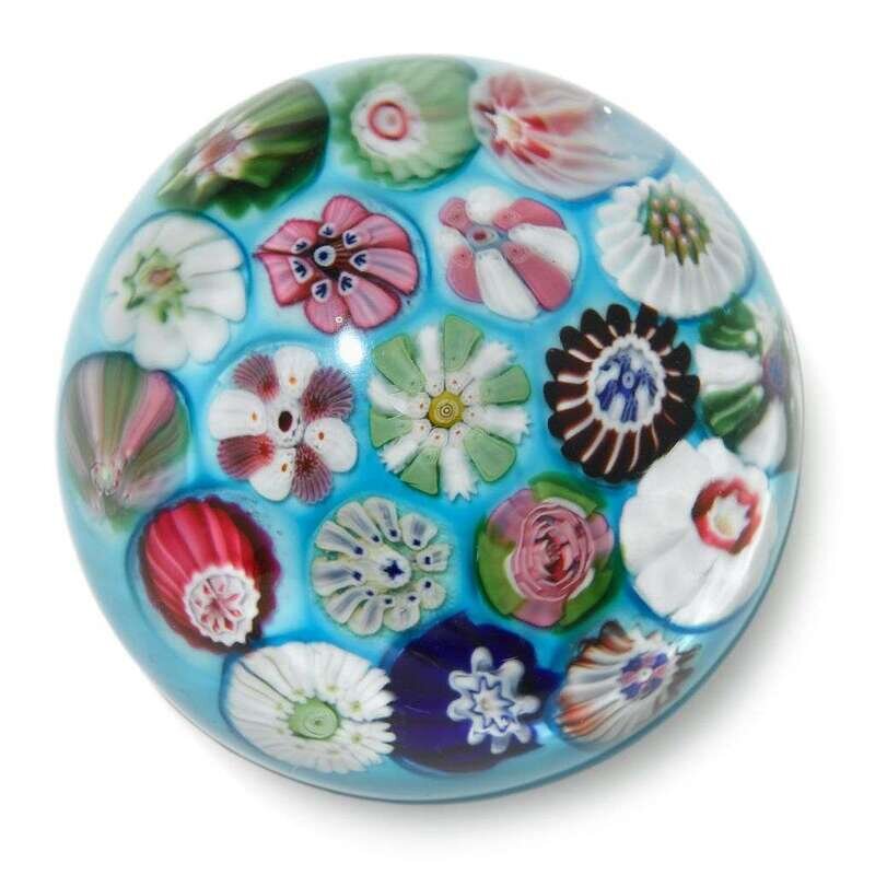 Antique Clichy spaced millefiori turquoise blue ground paperweight