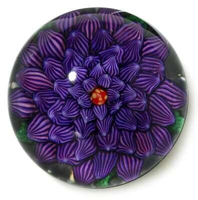 With many purple and pink striped petals, with an orange center, leaves underneath.