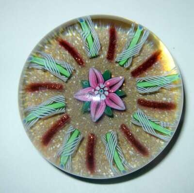 With a central pink clematis flower, enclosed by cut latticinio and gold canes, on a sand ground; underside with 'PY' cane.