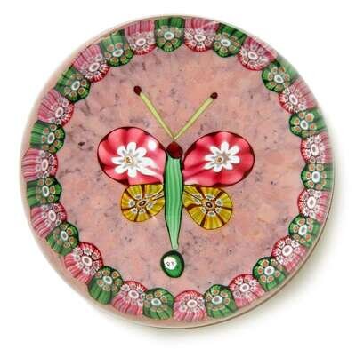 With a central butterfly with pink and yellow wings, surrounded by a pink and green millefiori garland, on a speckled pink ground, with 'PY' cane.