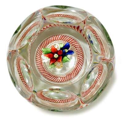The bouquet with white, red and blue flowers and two canes, with green leaves; the base enclosed by a salmon and clear torsade; with six side facets.