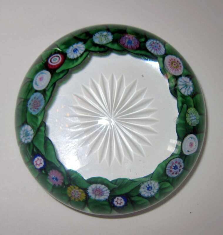 Unusual flattened form, with a ring of canes and leaves, encased in clear glass, with a star cut base; date cane for 1979.