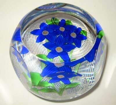 With four cobalt blue flowers issuing from green leafy stems, on a white latticinio basket, with six facetted sides; signature and date cane to underside.