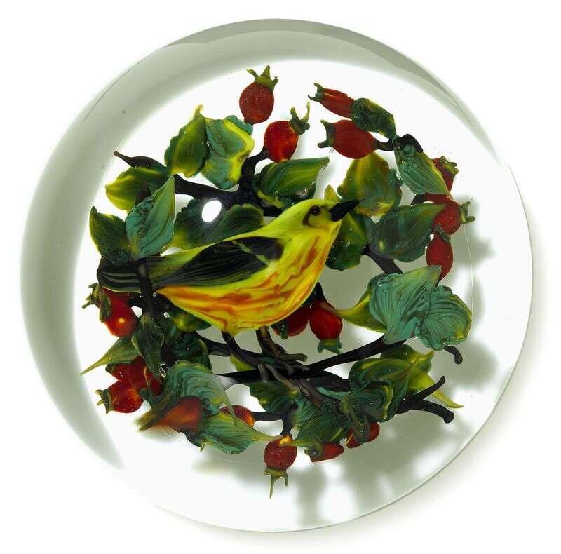 With a yellow warbler perched on gooseberry branches, signed 'Ayotte 1/25 '83'.