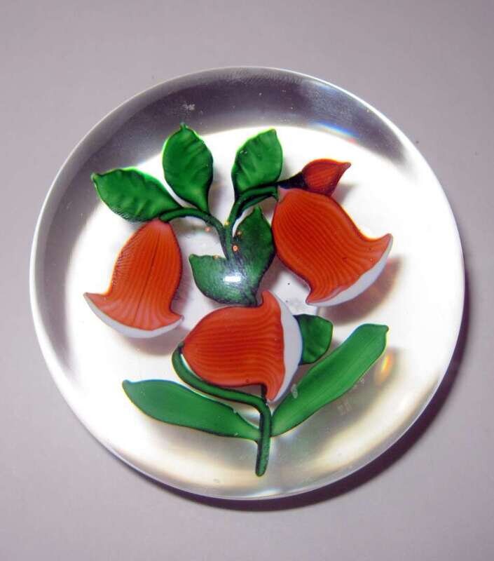 With three orange bell flowers issuing from a curved leafy green stem; underside with signature and date cane.