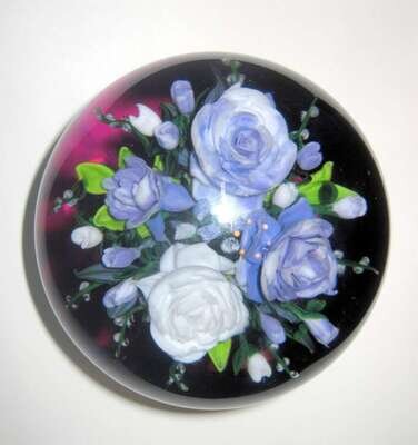 With three purple and one white rose, with various sizes of buds, on a leafy ground; encased in translucent amethyst glass; signed 'Rick Ayotte LE/25 2002'.