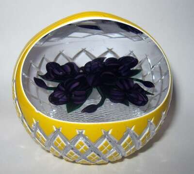 Unusual basket cut; with a deep purple iris bouquet, with diamond cut yellow overlay; with 'B' cane; with diamond cut base.