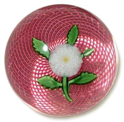With a central white ruffled blossom and bud, on a curved green stem, with ruffled leaves; on a pink latticinio basket.
