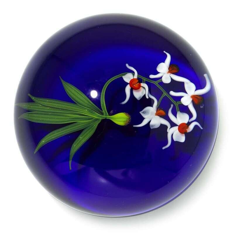 With an orchid spray, encased in cobalt blue glass, with an 'S' cane.