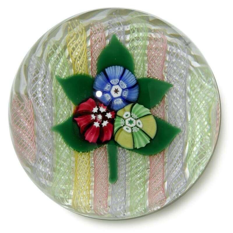 With a three cane bouquet and five green leaves and stem, on a bed of pink, lavender, green and yellow latticinio tubes and an underlying white latticinio bed; underside with 'JD 1993' cane.