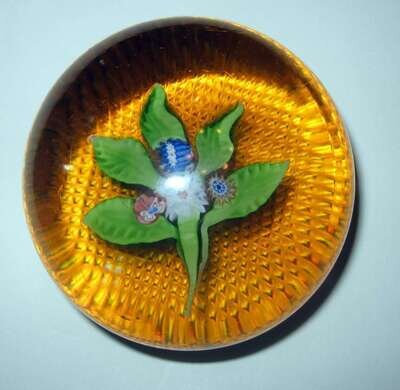 With a central floral bouquet with four flowerhead canes and five ruffled green leaves, enclosed in a translucent amber glass case, with diamond cutting to the underside.
