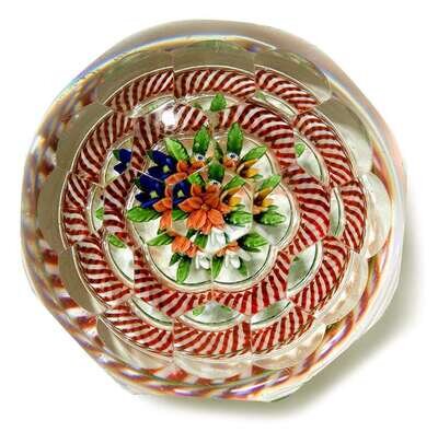 With a central bouquet with a salmon pink flowerhead, three buds and pointy green leaves, the base enclosed by a salmon and white latticinio torsade; within a beehive and circular faceted case.