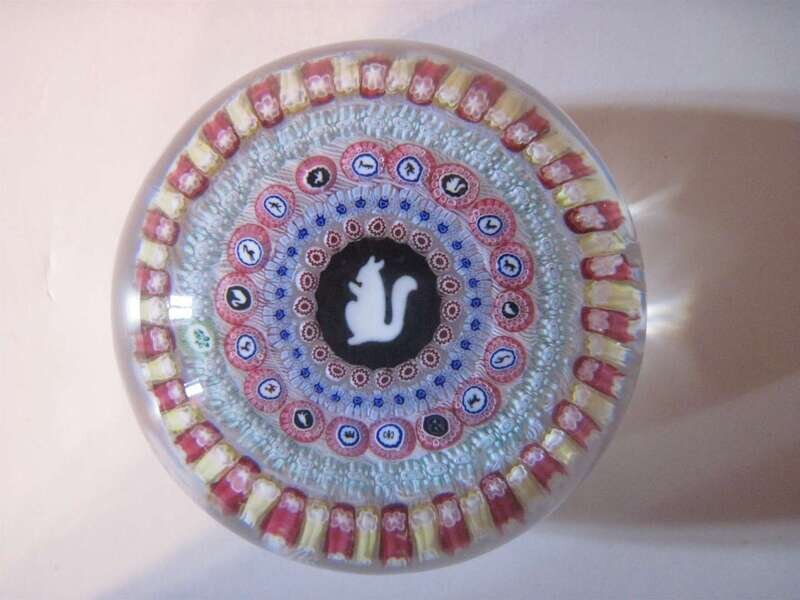 With a central silohette of a squirrel, enclosed by multicolored canes and a ring of silohette canes and various colored cane rings.