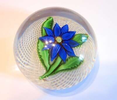 With a double row of petals, with cane center, issuing from a green stem with ruffled green leaves, with a white latticinio basket.