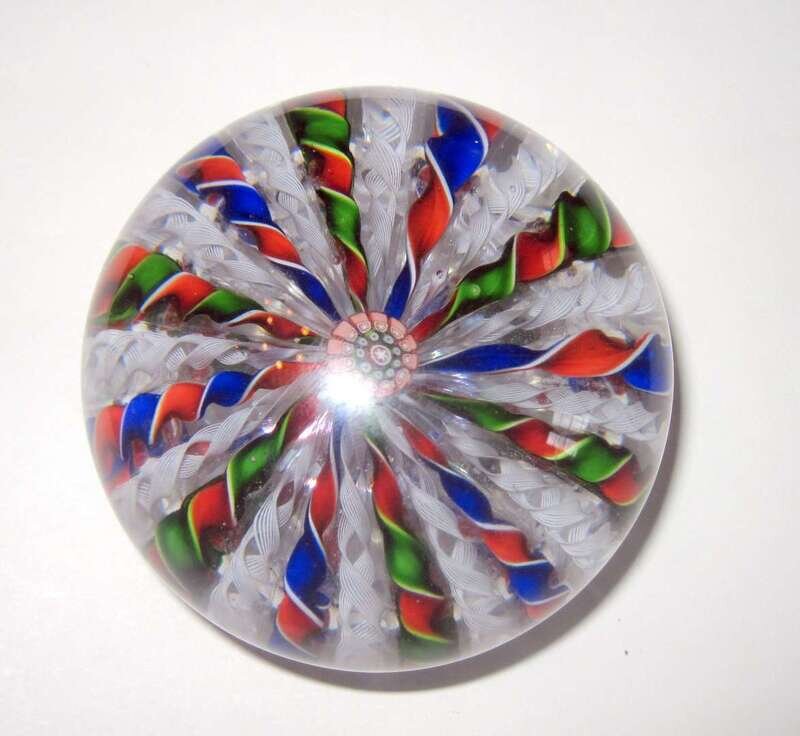 With a central salmon cane, surrounded by twisted ribbons of red and green, blue and red and white and clear.