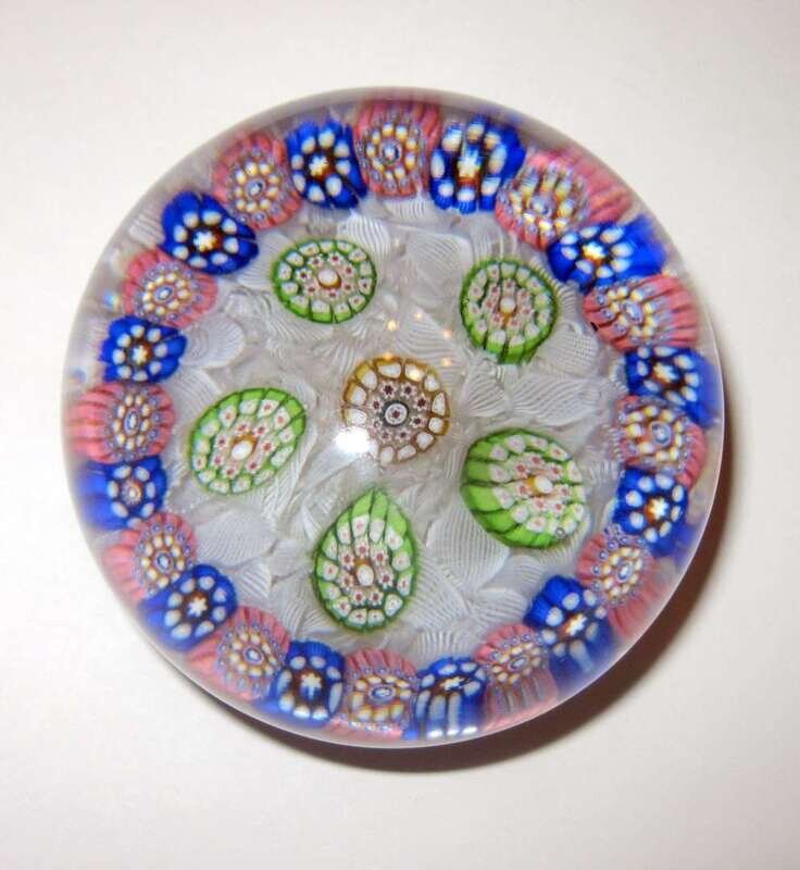 With a central yellow floret surrounded by five green florets, on a bed of upset muslin; enclosed by a ring of blue and pink canes.