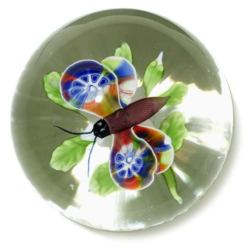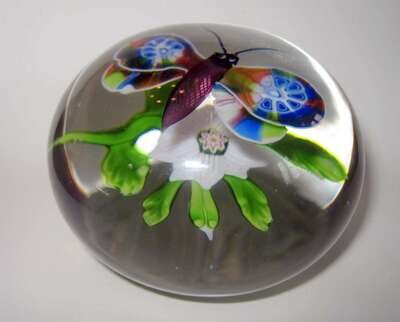 The butterfly with colorful wings and black antennae, with a dark purple latticinio body, above a single white clematis with rare central cane.