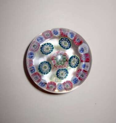 With a central green cane, enclosed by a ring of small white and red canes, with a ring of spaced white and blue canes, and a ring of red and white canes.