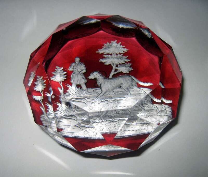 Depicting a hunter and gun dog in a landscape setting, on a transparent cranberry ground, with facet diamond cutting on the sides.