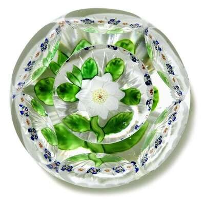 With a central white clematis with green leaves and a bud, enclosed by alternating white and blue and white cane garland; facetted sides.