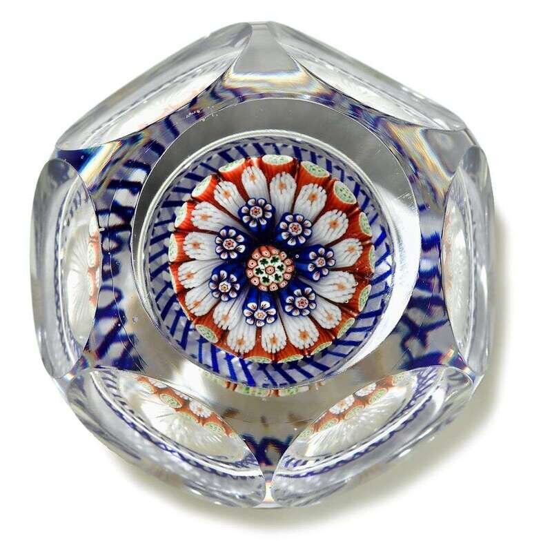 The mushroom consisting of a central shamrock cane surrounded by a rings of blue, white and coral canes; with a cobalt and white latticinio torsade and six circular facet windows; star cut base.