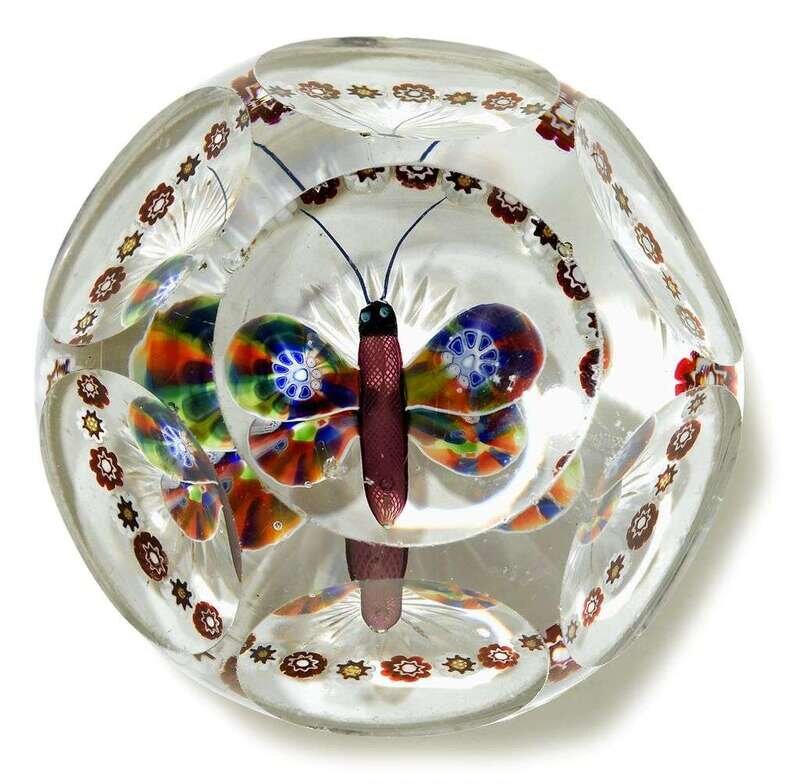 Good Antique Baccarat butterfly and millefiori garland faceted paperweight