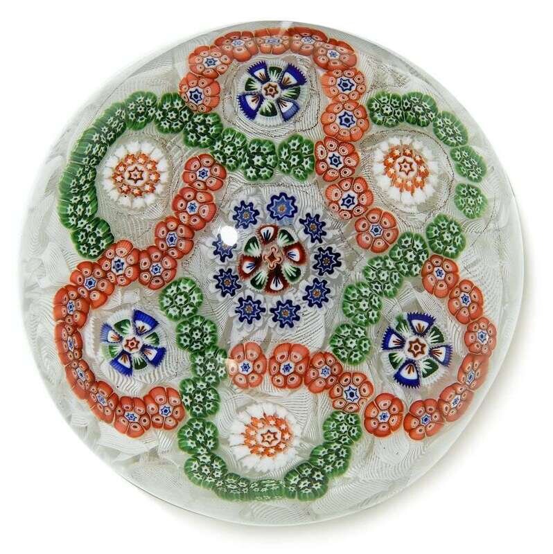With a pink trefoil garland overlapping a green trefoil garland, each loop with a cane, all centered by an arrow cane within a ring of blue and white canes; on a bed of upset muslin.