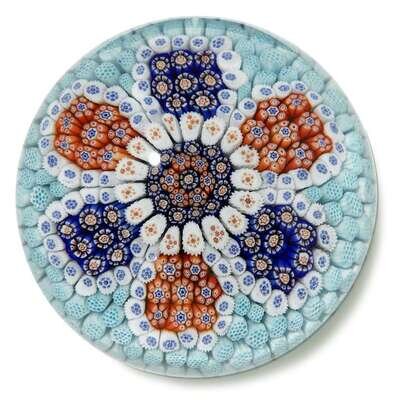 With a central cluster of cobalt and red canes, surrounded by white arrow canes and star red canes, outlined by white canes and six clusters of alternating complex cobalt blue and red canes; on a aqua honeycomb carpet ground.