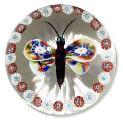 With a central butterfly with turquoise eyes and a dark body, enclosed by a garland of red and white canes; star cut base to the underside.