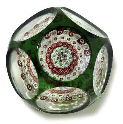 With a central arrowhead surrounded by four spaced concentric rings of assorted complex canes, in white, red and pink, over a clear ground with green-flash overlay, with five and one concave facets. .