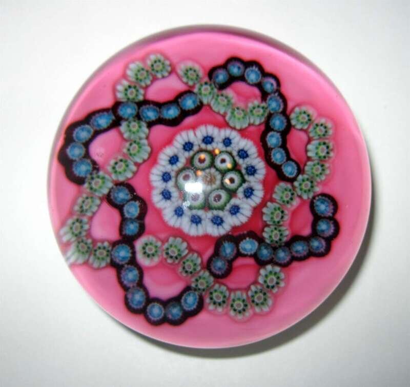 Antique Clichy millefiori interlaced trefoil garland pink ground paperweight