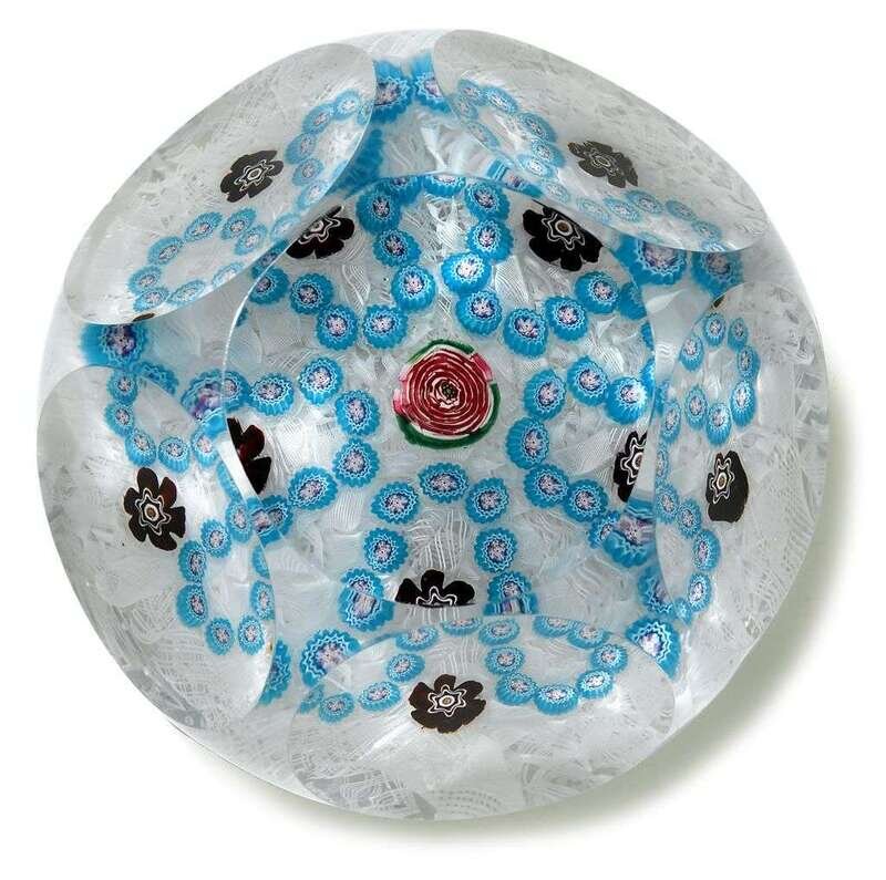 With a central Clichy rose, surrounded by a turquoise cane garland, the loops with deep red canes in-between, on a bed of upset muslin.