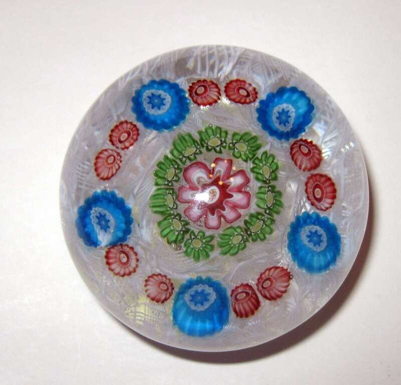 Centered by a pink pastrymold cane, surrounded by green canes, and a further ring of turquoise and coral canes; on a bed of upset muslin.