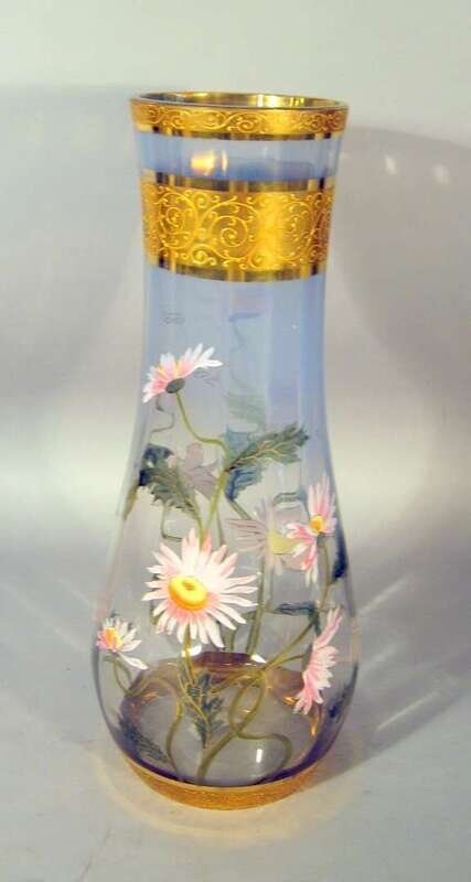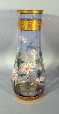 Of tapered baluster form, the neck with a gilt band above a clear body with trailing pink daisies, inscribed 'Souvenir de Marienbad'.