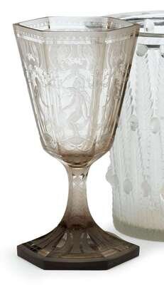 With six tapered panels, each each with finely etched decoration of a nude woman holding a garland, on an etched stem and base, inscribed 'Orrefors / Gate'.