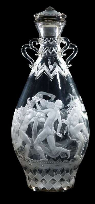 With a domed lid leading to pierced handles, the body finely etched with a Bacchic scene of nude woman dancing and playing instruments, the underside inscribed 'Orrefors / Gate'.