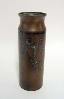 Of cylindrical form, with a flared rim and narrow neck, mounted with silver overlay of a bird on a flowering branch; underside with stamped 'Smaco' and 'Sterling decorated bronze', 'B1009'.