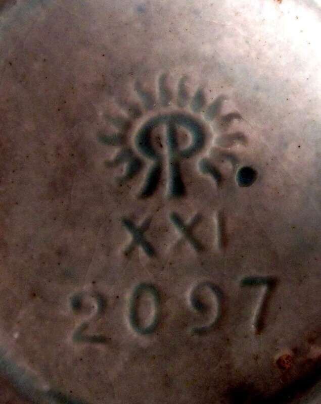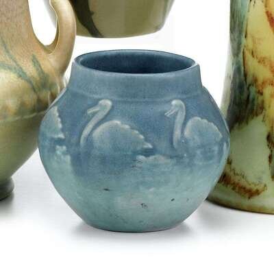Of spherical form, with a raised rim, the sides decorated with a band of swans, mottled blue matte glaze, underside with impressed Rookwood mark and '2097'.