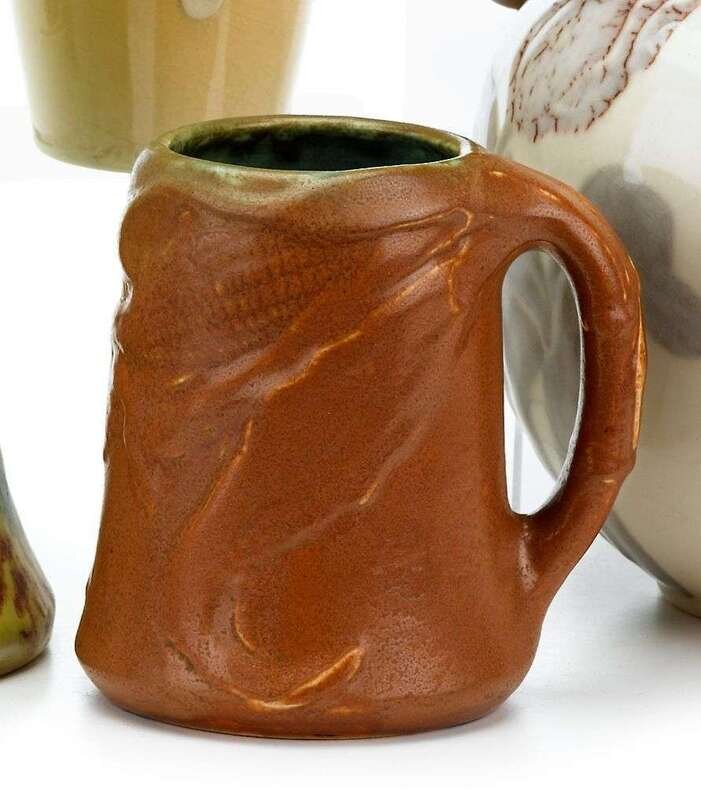 Rookwood molded matte-glaze art pottery mug decorated by john dee wareham, circa 1901