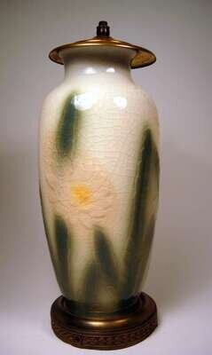 The lamp with a mottled green and cream glaze; the tile depicting a woodland landscape. (2).