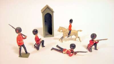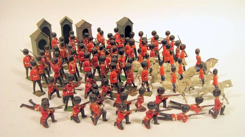 Comprising 6 riflemen, 15 kneeling riflemen, 50 standing figures, 2 kneeling figures with binoculars, 5 guard houses, 3 lying down and one on horseback; 7 smaller format guards on horseback etc.