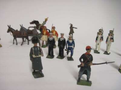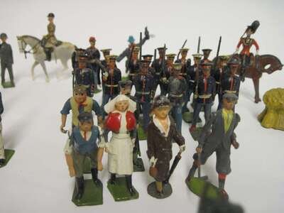 Comprising 2 Greek Evzone; 17 United States marines, in dress uniform; 3 sailors; 3 civilians; 1 nurse; 1 golfer; 3 donkeys; 1 mounted horseman in dress uniform; 28 various; haystack and goat also included are various loose arms etc.