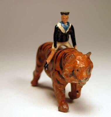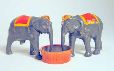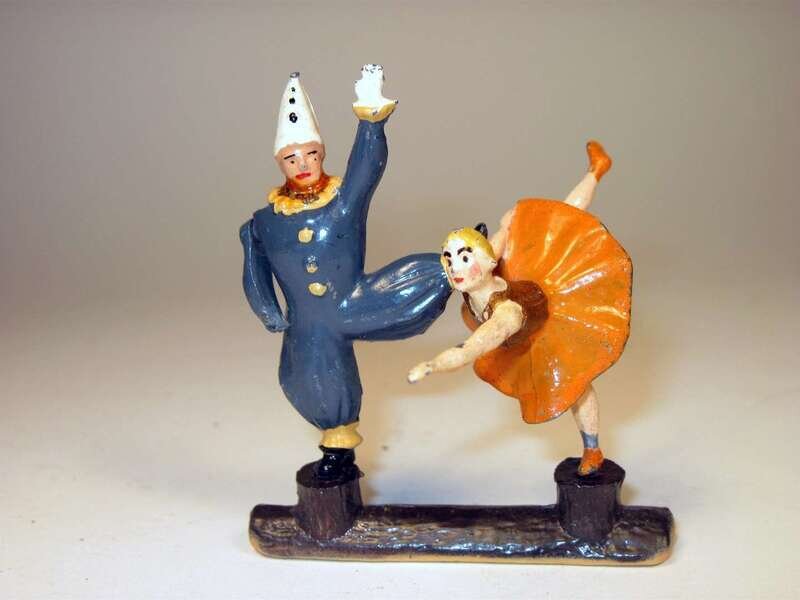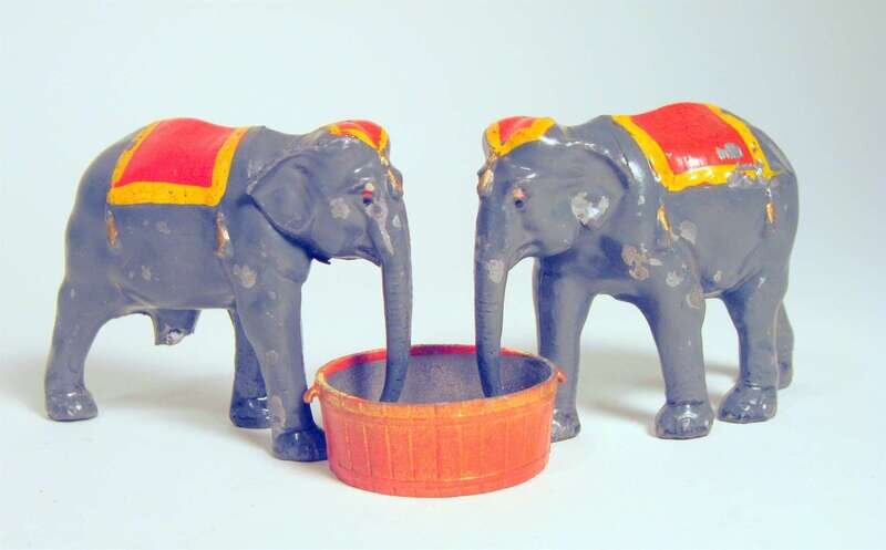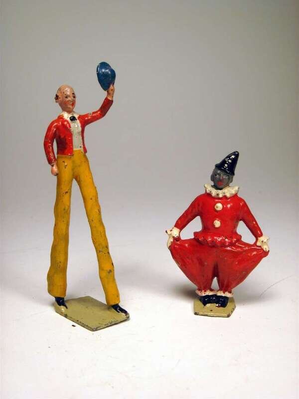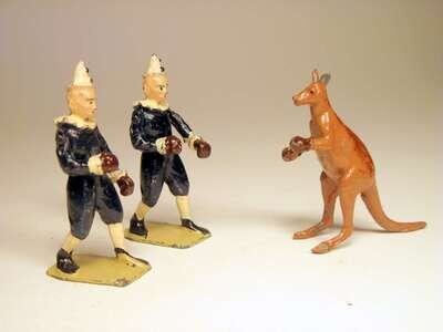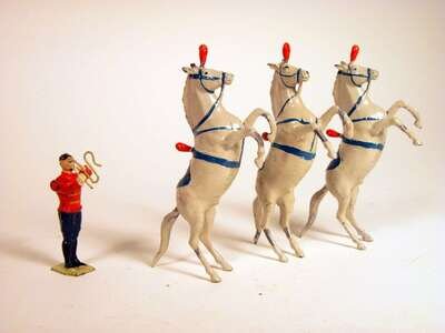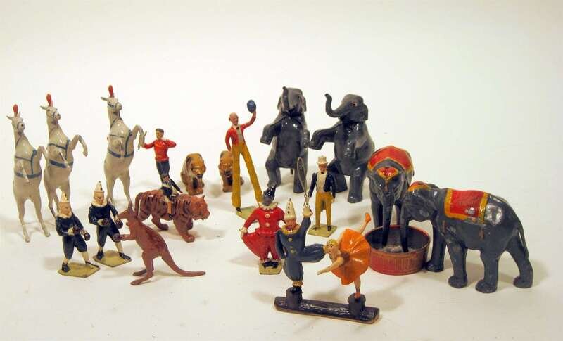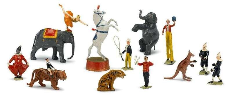 Comprising 2 boxing clowns, boxing kangaroo, ring master, man on stilts, 4 show horses, 4 elephants, acrobat, clown, 2 tigers, ring and various equipment pieces; unboxed.