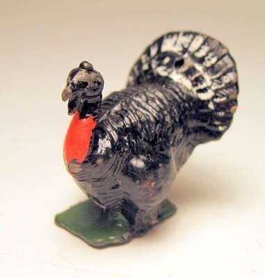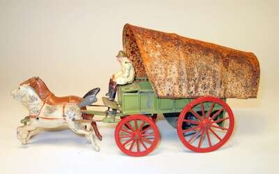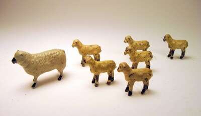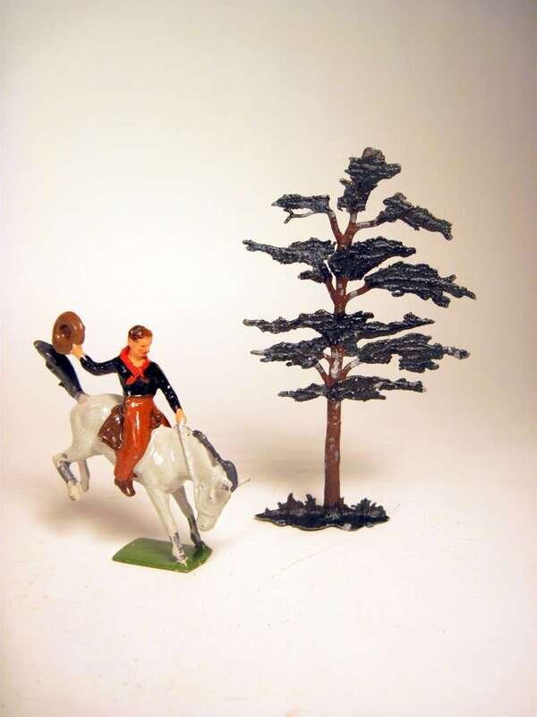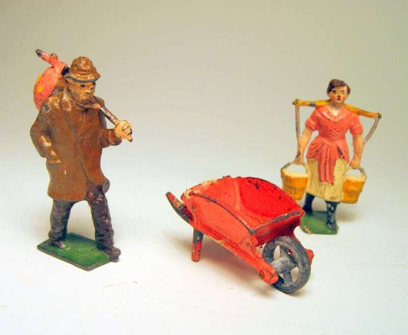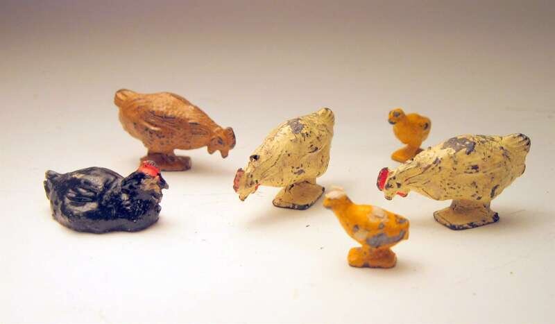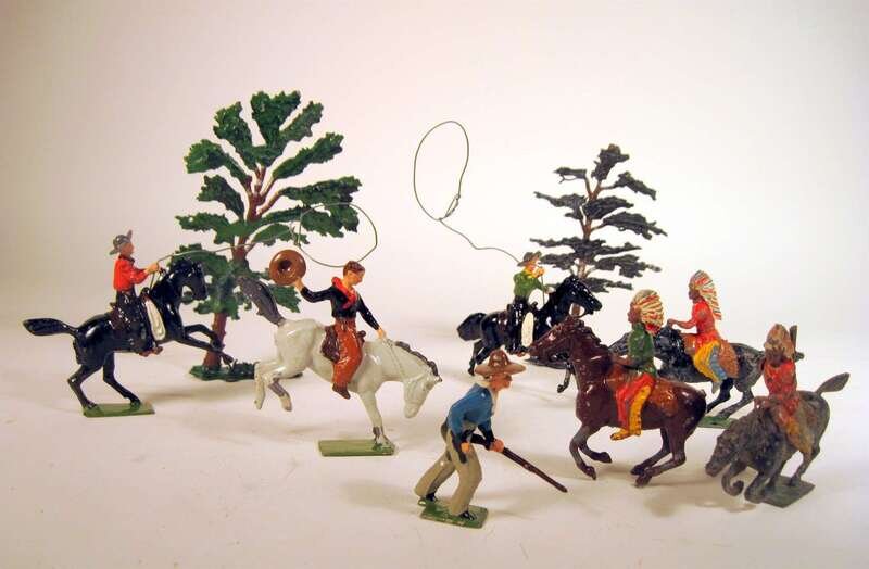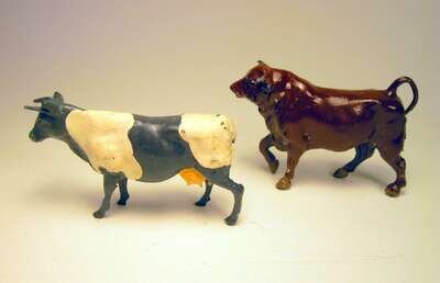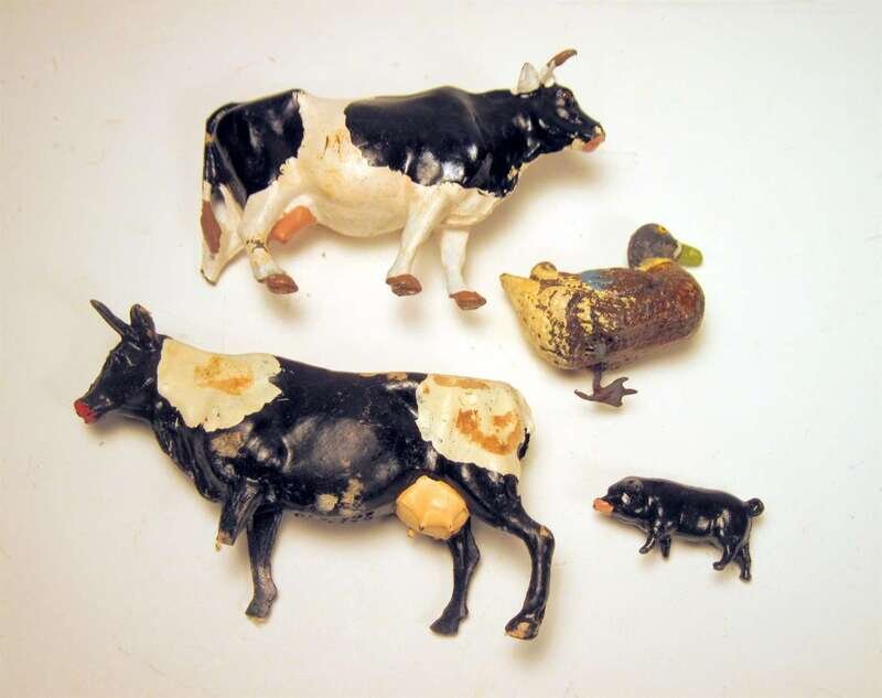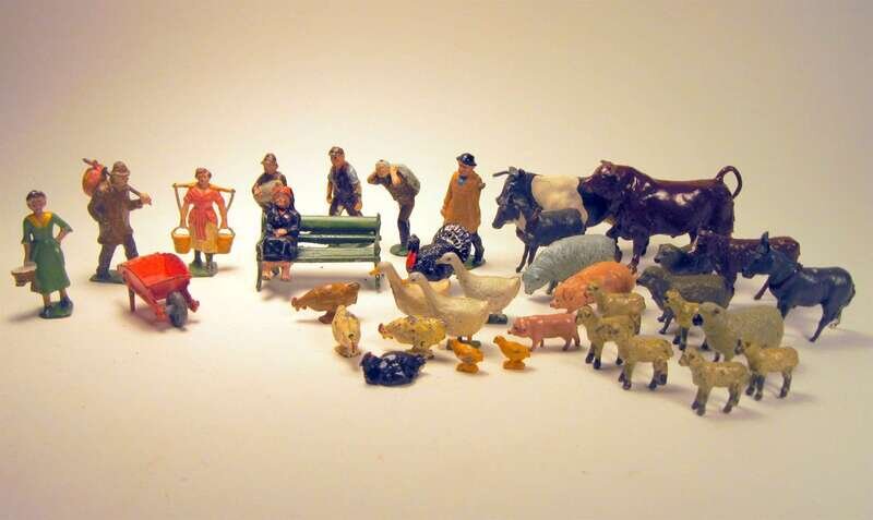 Comprising a bull, 2 donkeys, 5 sheep, 6 lambs, turkey, 8 pigs, 5 chickens, 2 chicks, 2 geese, duck, 4 cows, horse, 6 arm attendants, duck, cow, a hobo, wheelbarrow and a bench; together with cowboys, 2 trees, indians and a horsedrawn wagon.