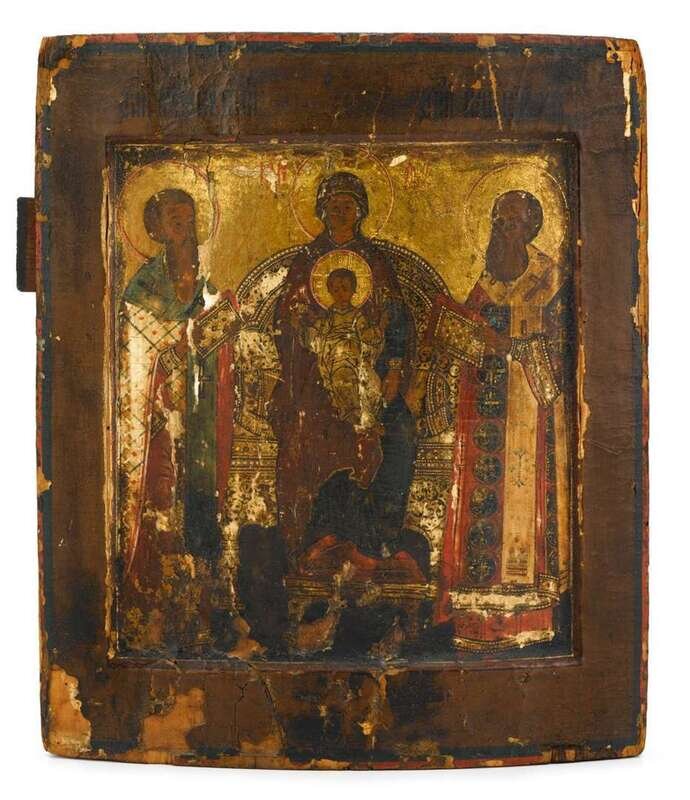Convex form wood panel, polychrome and gilt depicting Madonna and child and possibly saints Boris and Glyeb.